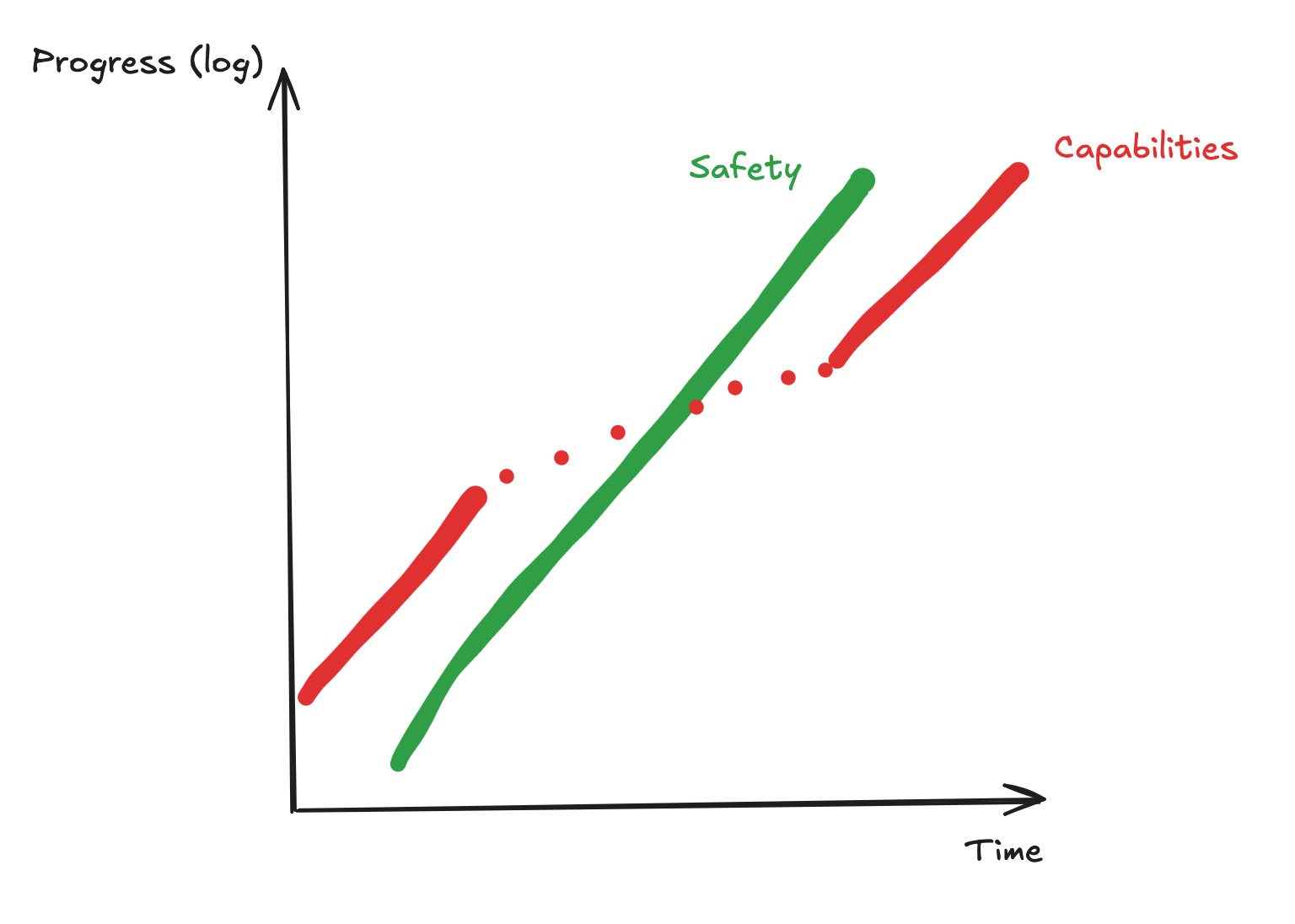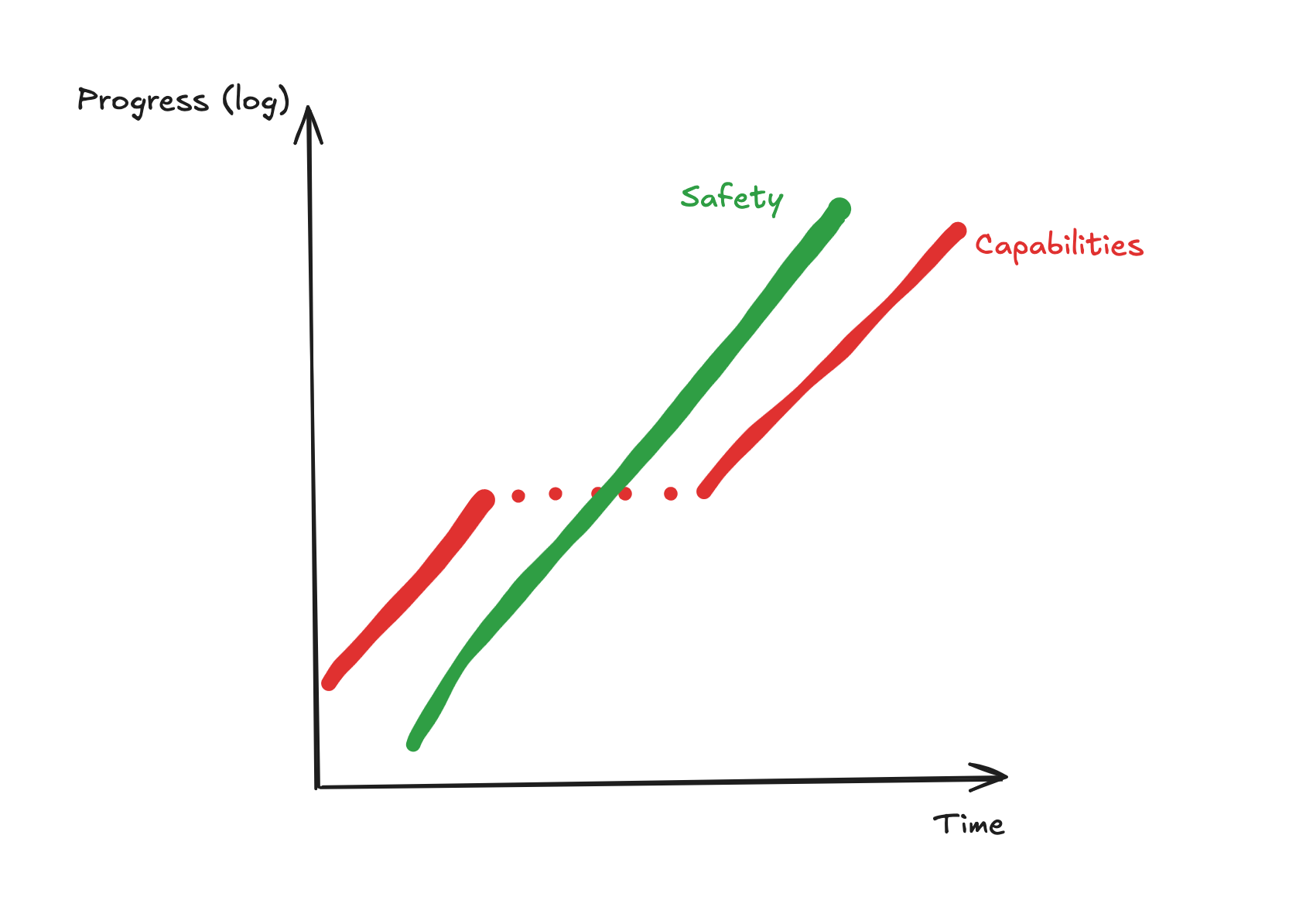 As it stands, in the case of any pause, we would want for the safety research to have progress as much as capabilities research post-pause, and also we would want for the rate of progress of safety research (loosely the exponent on the exponential) to be comparable to the rate of progress of capabilities research. To ensure that we can resume AGI development, we counterintuitively want to be more rigorous about pausing - setup infrastructure to measure the rate of safety progress, and also set up infrastructure to ensure that, if we resume AGI development too early, we have the optionality to pause again. If we make it so that we can pause again, we can unpause easier and bring about abundance faster.