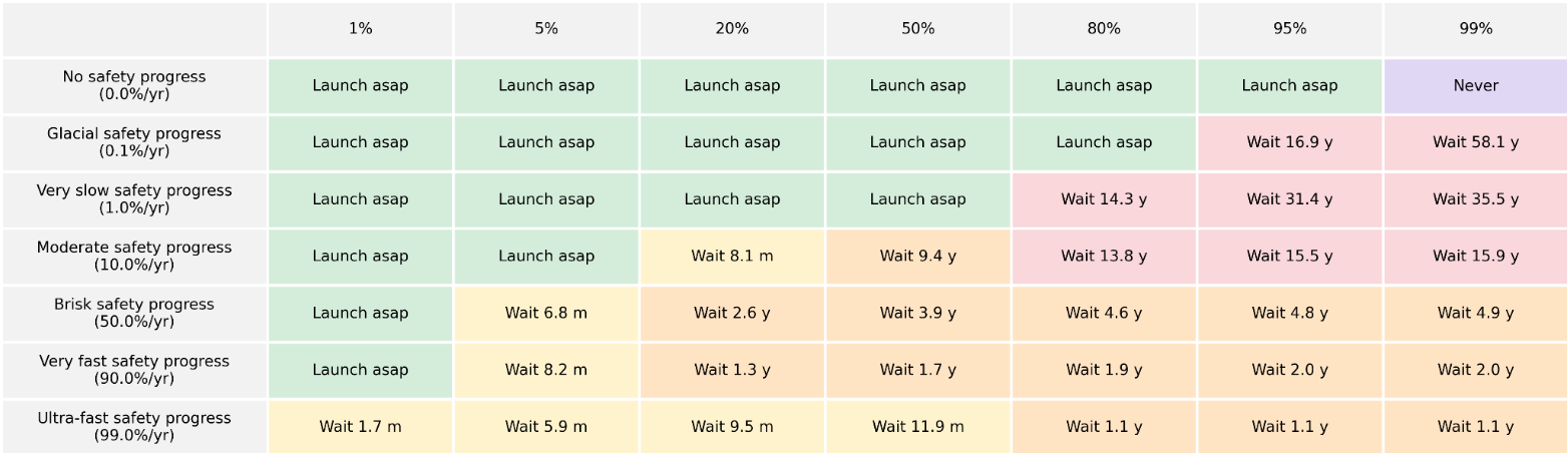 In any case, I feel fairly confident saying that we get safety overhang, and we should expect, from a short pause (under a decade for example) for AGI progress to happen at around $1/2 - 1/5$ of the the current rate.